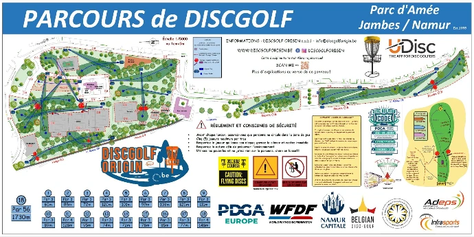 Le parcours se situe au Parc d'Amée à Jambes. Il est accessible 7j/7 et entièrement gratuit, il suffit d'emporter votre propre matériel. Nous en mettons à votre disposition durant les week-end, réservation sur simple demande via la rubrique "Contactez-nous".